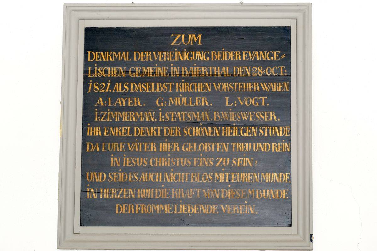 Tafel über den Zusammenschluß von reformierter und lutherische Gemeinde zur Badischen Landeskirche